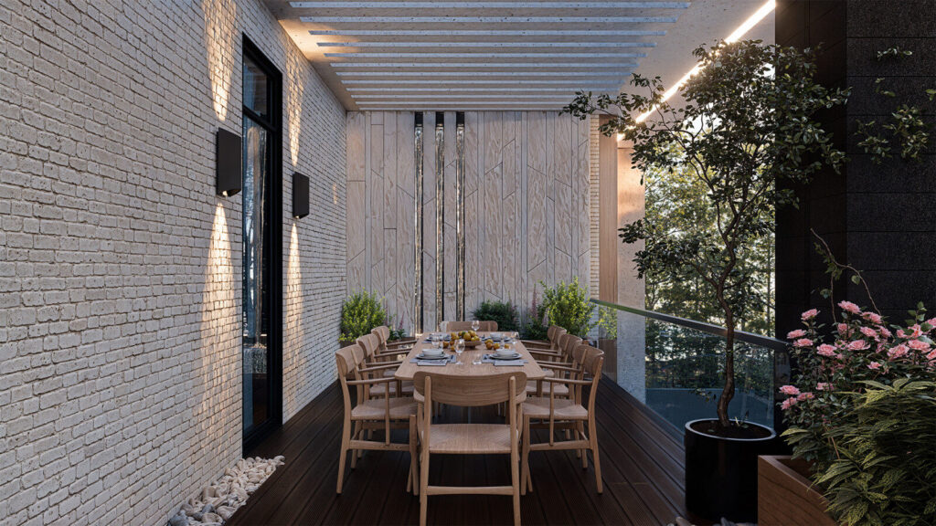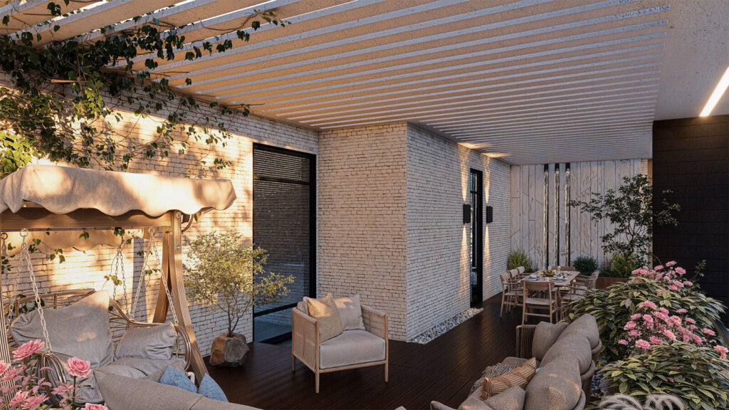 Müşterimizin istekleri doğrultusunda bir büyük terasa sahip olan bu villa yemek ve oturma alanı haricinde 4 yatak odasına sahiptir.